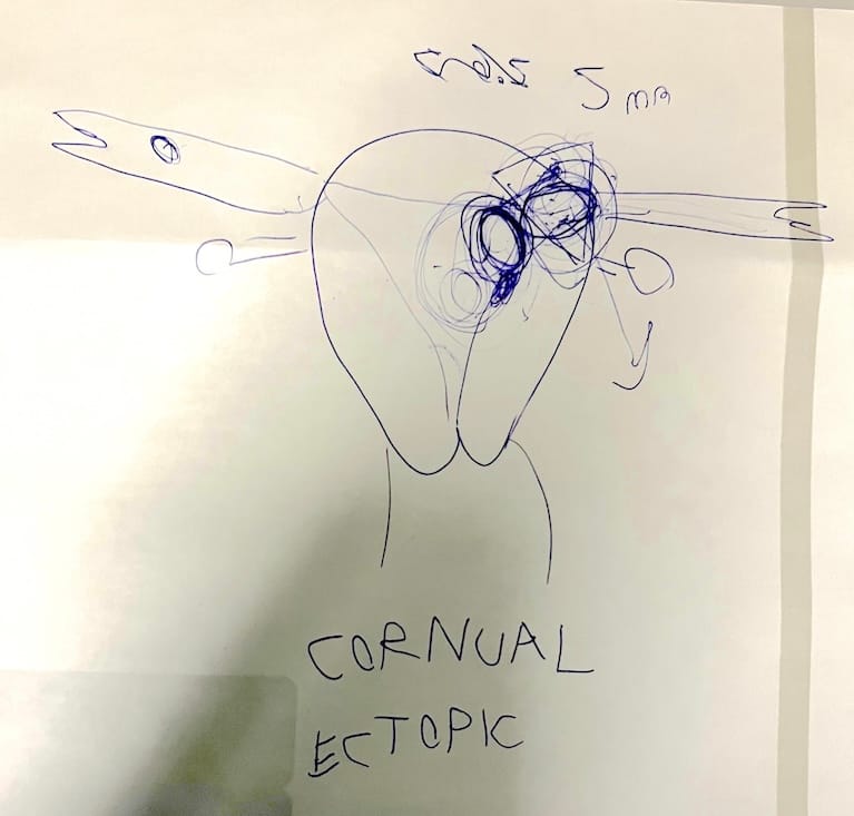 While I was seen quickly, my stay added up to be over six hours waiting around to see an actual doctor. Given a bothersome IV I didn't need, want or ultimately use, I was told I might have a cornual ectopic pregnancy - a potentially life threatening condition that could require immediate surgery if confirmed. After days of teetering on the edge of despair, my doctor at the high-risk maternal fetal medicine clinic scoffed at the report from the ER. "Your radiologist didn't know what the hell he was looking at," he said. "You can forget that 'diagnosis.' The position of your embryo looks fine to me." The matter-of-fact emotional whiplash was dizzying. Repeat tragedy averted!